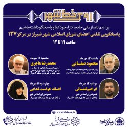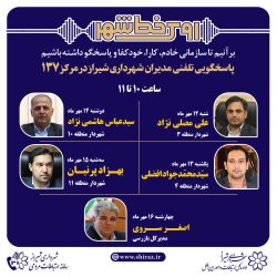 علی مصلی‌نژاد، سید محمدجواد افضلی، سید عباس هاشمی‌نژاد و بهزاد پرنیان، شهرداران مناطق ۳، ۴، ۱۰ و ۱۱ شیراز در روزهای ۱۲ تا ۱۵ مهرماه و اصغر سروی مدیرکل بازرسی، در روز ۱۶ مهرماه از ساعت ۱۰ تا ۱۱ به‌صورت تلفنی پاسخگوی سؤالات و مشکلات شهروندان در حوزه‌های مختلف مدیریت شهری هستند.