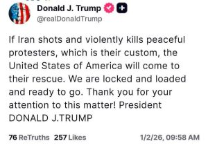 رئیسجمهور آمریکا نوشت: اگر ایران بهروی معترضان مسالمتآمیز شلیک کند و آنها را بهطور خشونتآمیز بکُشد، آمریکا به کمک آنها خواهد آمد. ما کاملا برای اقدام آمادهایم.