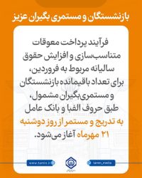 فرآیند پرداخت معوقات متناسبسازی و افزایش حقوق سالیانه مربوط به فروردین، برای تعداد باقیمانده بازنشستگان و مستمریبگیران مشمول، طبق حروف الفبا و بانک عامل به تدریج و مستمر از روز دوشنبه ۲۱ مهرماه آغاز میشود.