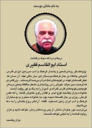 مدیرکل فرهنگ و ارشاد اسلامی فارس با نهایت تأثر و تألم، به اطلاع اصحاب فرهنگ، ادب و هنر استان فارس رساند: امروز روز بدرود با یکی از ریشهداران ادبیات عامه فارس، زندهیاد ابوالقاسم فقیری، نویسنده، پژوهشگرِ، روزنامهنگار و فارسشناسِ برجسته است که دارفانی را وداع گفت و این فقدان دلخراش را به خاندان ایشان و جامعه فرهنگ و هنر تسلیت عرض می دارم.