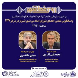 محمدتقی تذروی نایبرئیس شورا و ناظر شورای اسلامی شهر در شهرداری منطقه ۲ و مهدی طاهری رئیس کمیته شفافیت، صیانت از حقوق شهروندان و سلامت اداری شورای اسلامی شهر شیراز بهصورت تلفنی در ساعت ۱۱ تا ۱۲ به ترتیب در روزهای ۲۹ تیر و یکم مردادماه پاسخگوی سؤالات، پیشنهادات و مشکلات شهروندان در حوزههای مختلف مدیریت شهری از طریق سامانه ارتباطات مردمی ۱۳۷ خواهند بود.