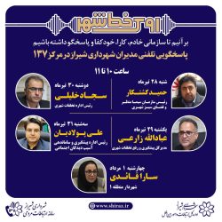 برایناساس، حمید کشتکار رئیس سازمان سیمامنظر و فضای سبز شهری، عبادالله زارعی مدیرکل پیشگیری و رفع تخلفات شهری، سجاد خلیلی و علی پولادیان، رؤسای ادارت تخلفات شهری و پیشگیری و ساماندهی آسیبهای اجتماعی، و سارا قائدی شهردار منطقه یک شیراز به ترتیب از ۲۸ تیر تا یکم مردادماه از ساعت ۱۰ تا ۱۱ بهصورت تلفنی پاسخگوی سؤالات و مشکلات شهروندان در حوزههای مختلف مدیریت شهری خواهند بود.
