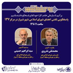 محمدتقی تذروی نایبرئیس شورای اسلامی شهر و سید ابراهیم حسینی رئیس شورای اسلامی شهر، به ترتیب ناظرین در شهرداری مناطق ۲ و ۱۱ شیراز، بهصورت تلفنی در ساعت ۱۱ تا ۱۲ در روزهای ۲۰ و ۲۲ مهرماه پاسخگوی سؤالات، پیشنهادات و مشکلات شهروندان در حوزههای مختلف مدیریت شهری از طریق سامانه ارتباطات مردمی ۱۳۷ است.