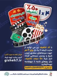 ایثارگران میتوانند با استفاده از کد تخفیف زیر، یک بار برای ۴ نفر، بلیط سینماهای سعدی، ایران، شیراز و پردیس سینمایی استاد تارخ را با ۵۰ درصد تخفیف از سایت گیشه ۷ تهیه نمایند. این تخفیف ویژه روزهای شنبه تا چهارشنبه است.